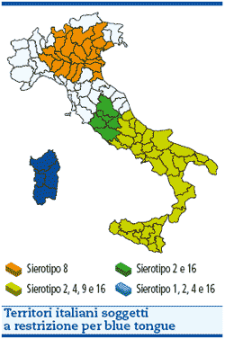 sierotipi BTV 1, 2, 4, 9, 16 ripartiti secondo le aree specifiche.